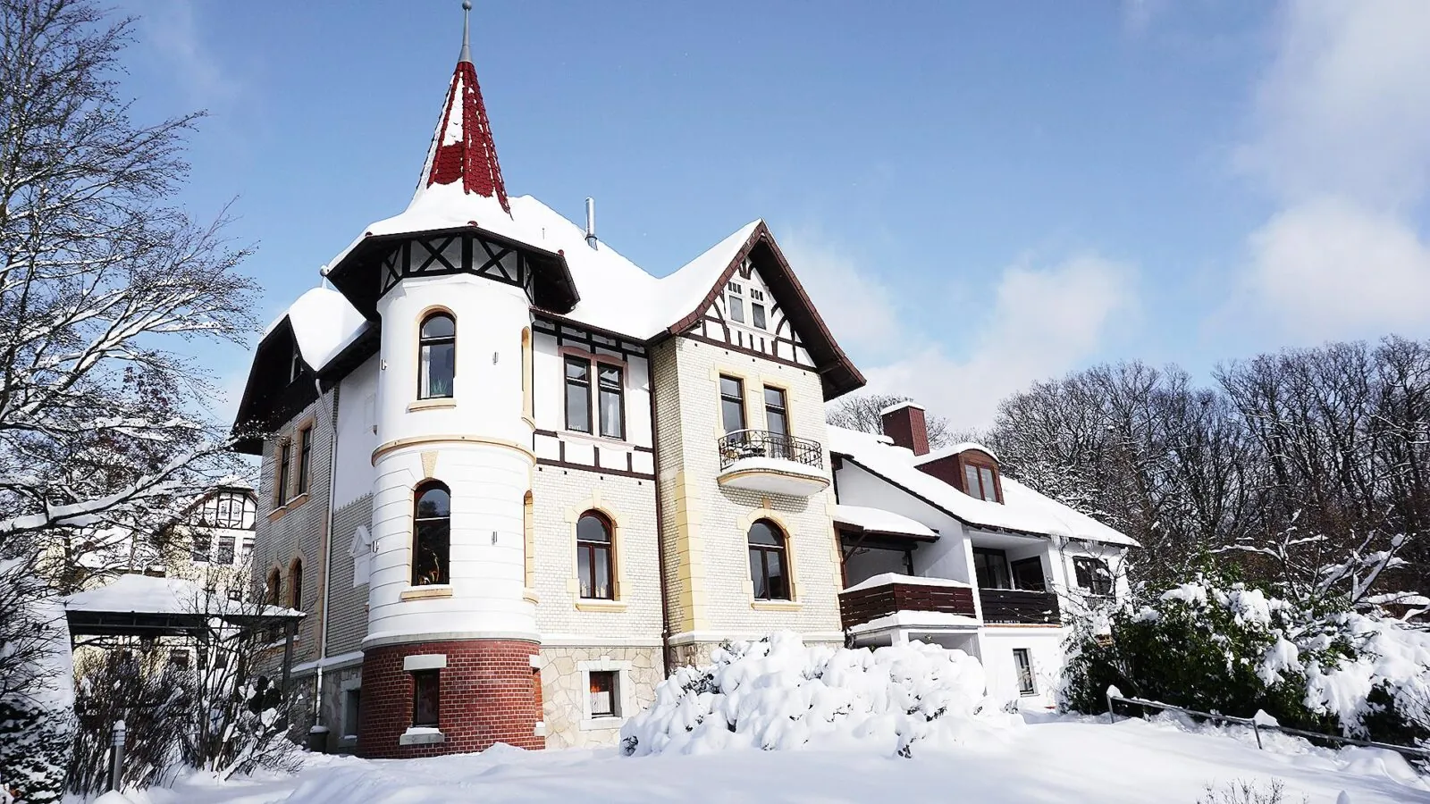 Das Gesamtanwesen auf dem Pfaffenberg 27 hat ein schlossartiges Ambiente. Es besteht aus der 1901 erbauten Villa mit Türmchen und einem um 1980 errichteten Anbau sowie einem separaten Ferienhaus auf einem 2000 m² großen Grundstück in idyllischer Ruhe zwischen Rauschen des Waldes und Zwitschern der Vögel.